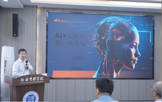 我院金融系副主任王峰虎带来《AI+金融前沿进展:挑战与应对》主旨演讲。王老师分享了AI技术在风险管理、算法交易、个性化金融服务、区块链金融等领域的前沿应用,指出AI与金融相融合,可以全面提升金融服务效率、智能化水平和金融安全性,实现金融业务从经验驱动到数据驱动的模式转变。王老师解析了“AI+金融”从单点融合到协同创新的融合路径,分析了从“服务中介”到“智能中枢”产业生态演进趋势,探讨了面临的技术瓶颈、监管困境及“AI+金融”复合型人才培养改革。